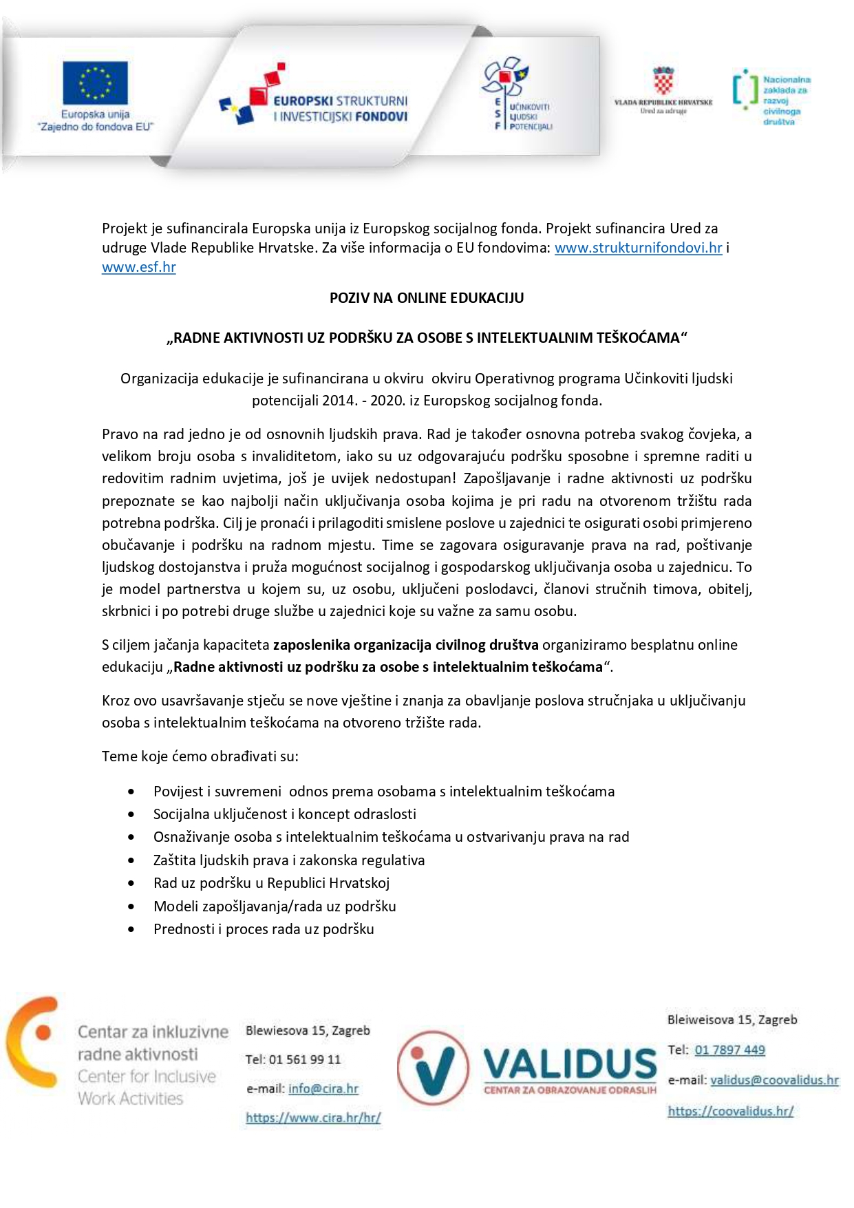 Centar za inkluzivne radne aktivnosti, u partnerstvu s Centrom za obrazovanje odraslih Validus, provodi jednogodišnji projekt naziva “Ojačajmo Civilno Društvo”. U okviru projekta za zaposlenike organizacija civilnog društva s područja 7 županija (Grad Zagreb, Sisačko-moslavačka, Bjelovarsko-bilogorska, Požeško-slavonska, Bordskoposavska, Osječko-baranjska, Šibensko-kninska) organiziramo besplatnu online edukaciju „Radne aktivnosti uz podršku za osobe s intelektualnim teškoćama“.