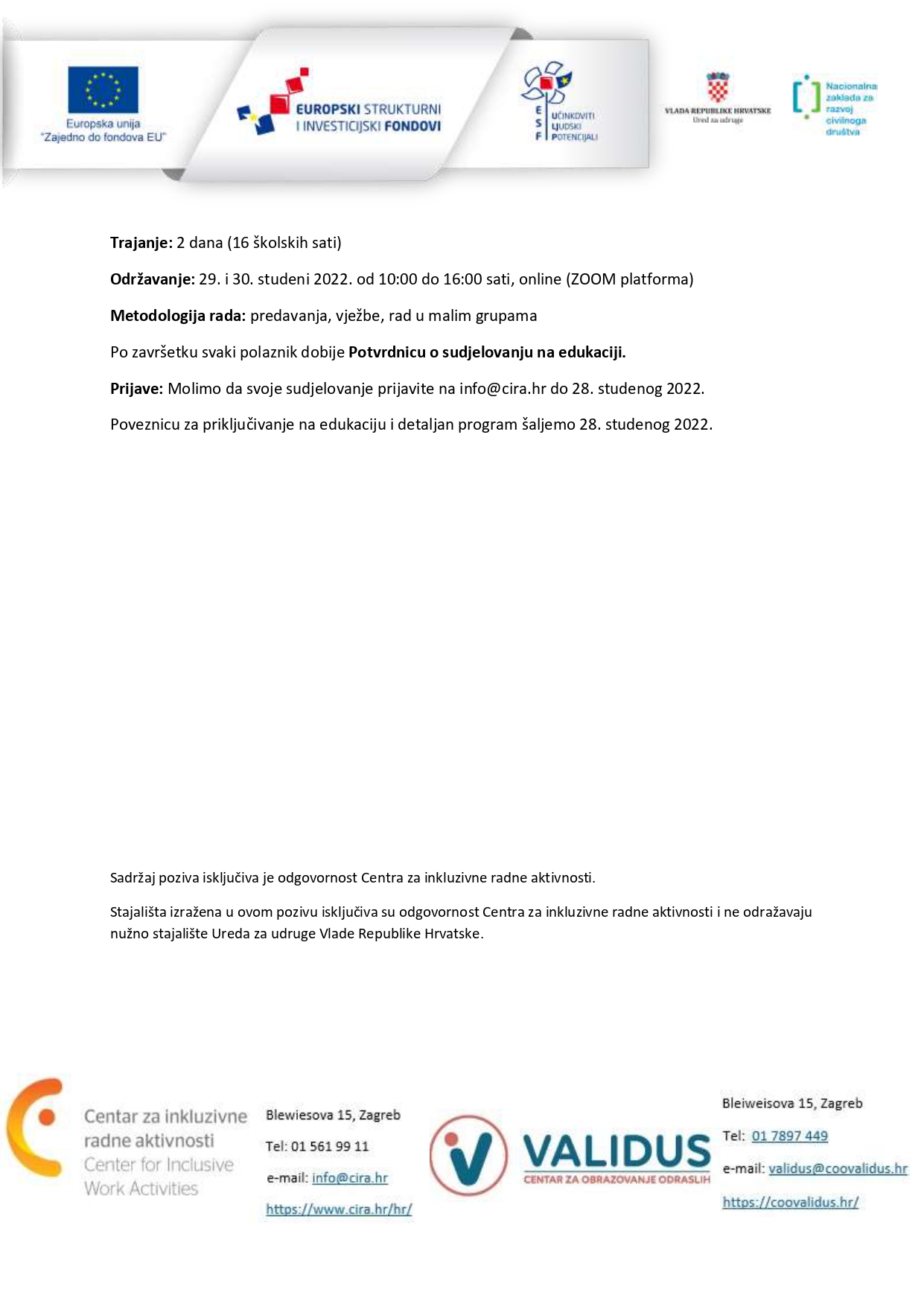 Projekt je sufinancirala Europska unija iz Europskog socijalnog fonda. Projekt sufinancira Ured za udruge Vlade Republike Hrvatske. Za više informacija o EU fondovima: www.strukturnifondovi.hr i www.esf.hr