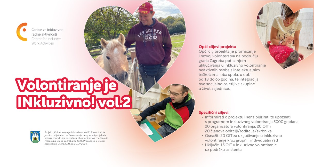 Opći cilj projekta je promicanje i razvoj volonterstva na području grada Zagreba poticanjem uključivanja u inkluzivno volontiranje neaktivnih osoba s intelektualnim teškoćama, oba spola, u dobi od 18 do 65 godina, te integracija ove socijalno osjetljive skupine u život zajednice.