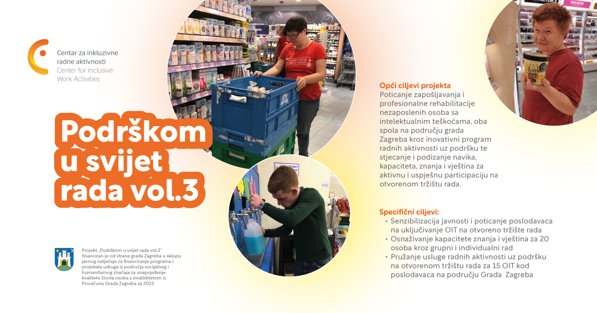 Opći cilj projekta je poticanje zapošljavanja i profesionalne rehabilitacije nezaposlenih osoba sa intelektualnim teškoćama, oba spola, na području Grada Zagreba kroz inovativni program radnih aktivnosti uz podršku te stjecanje i podizanja navika, kapaciteta, znanja i vještina za aktivnu i uspješnu participaciju na otvorenom tržištu rada.